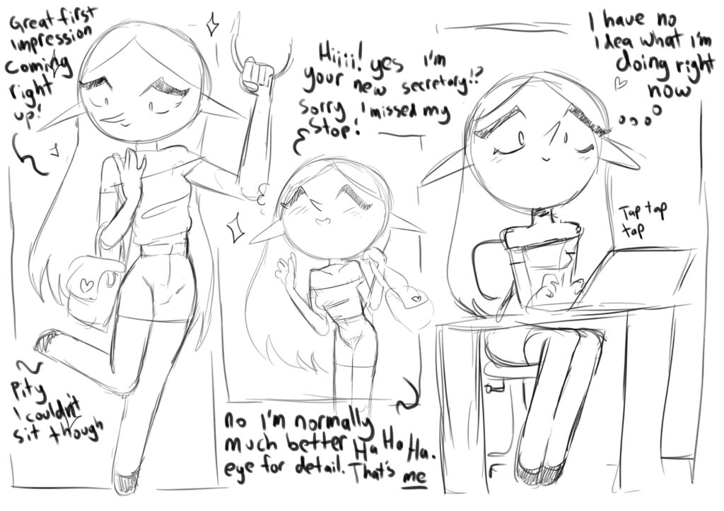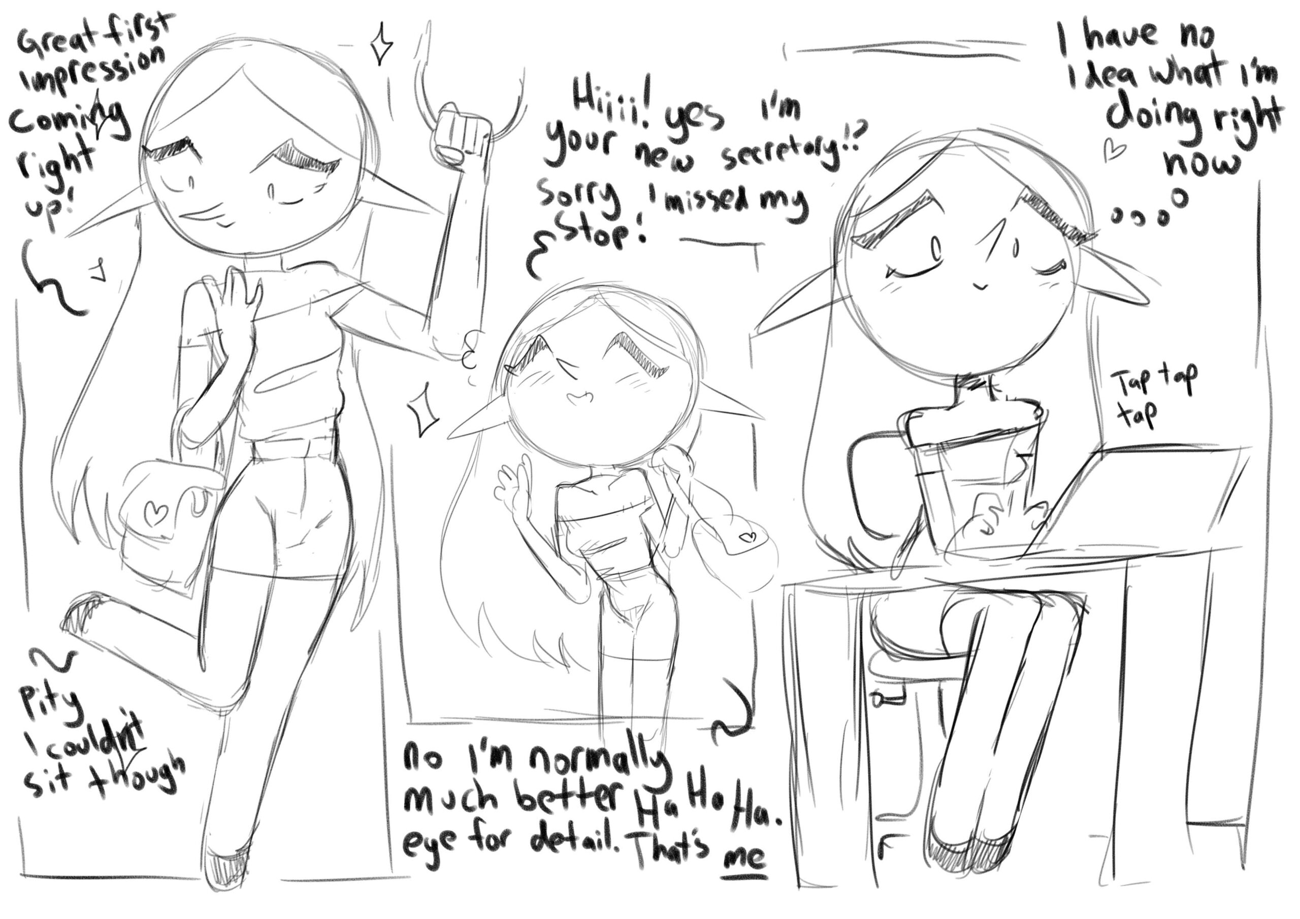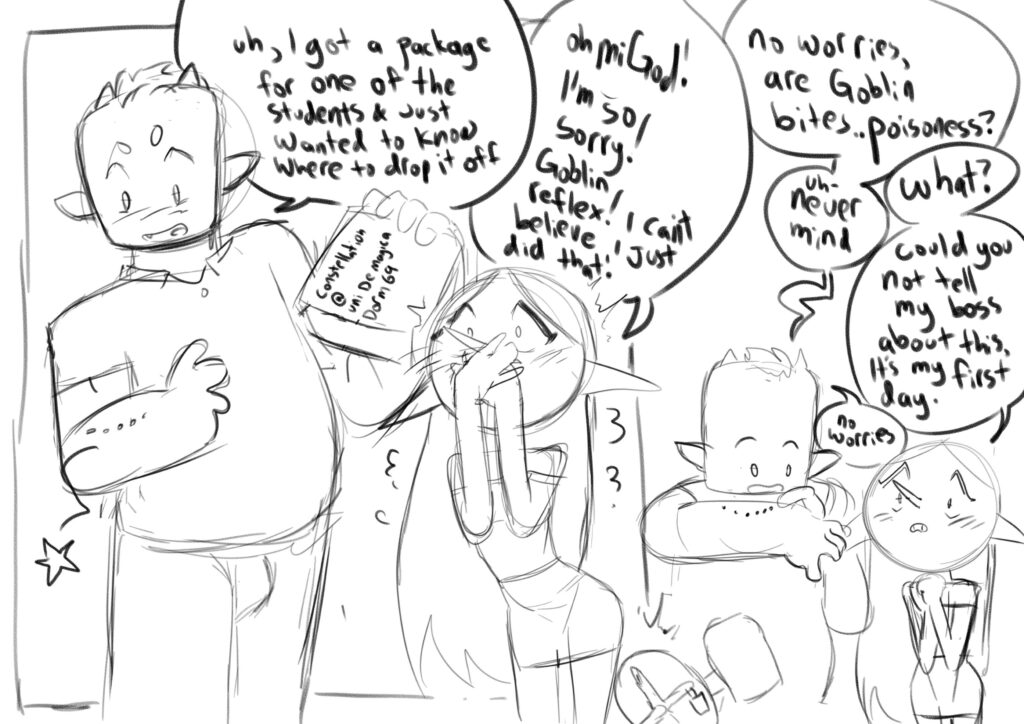 A little passion sketch comic with a currently unnamed OC goblin girl. Set in the administration block of the Uni De Magica.